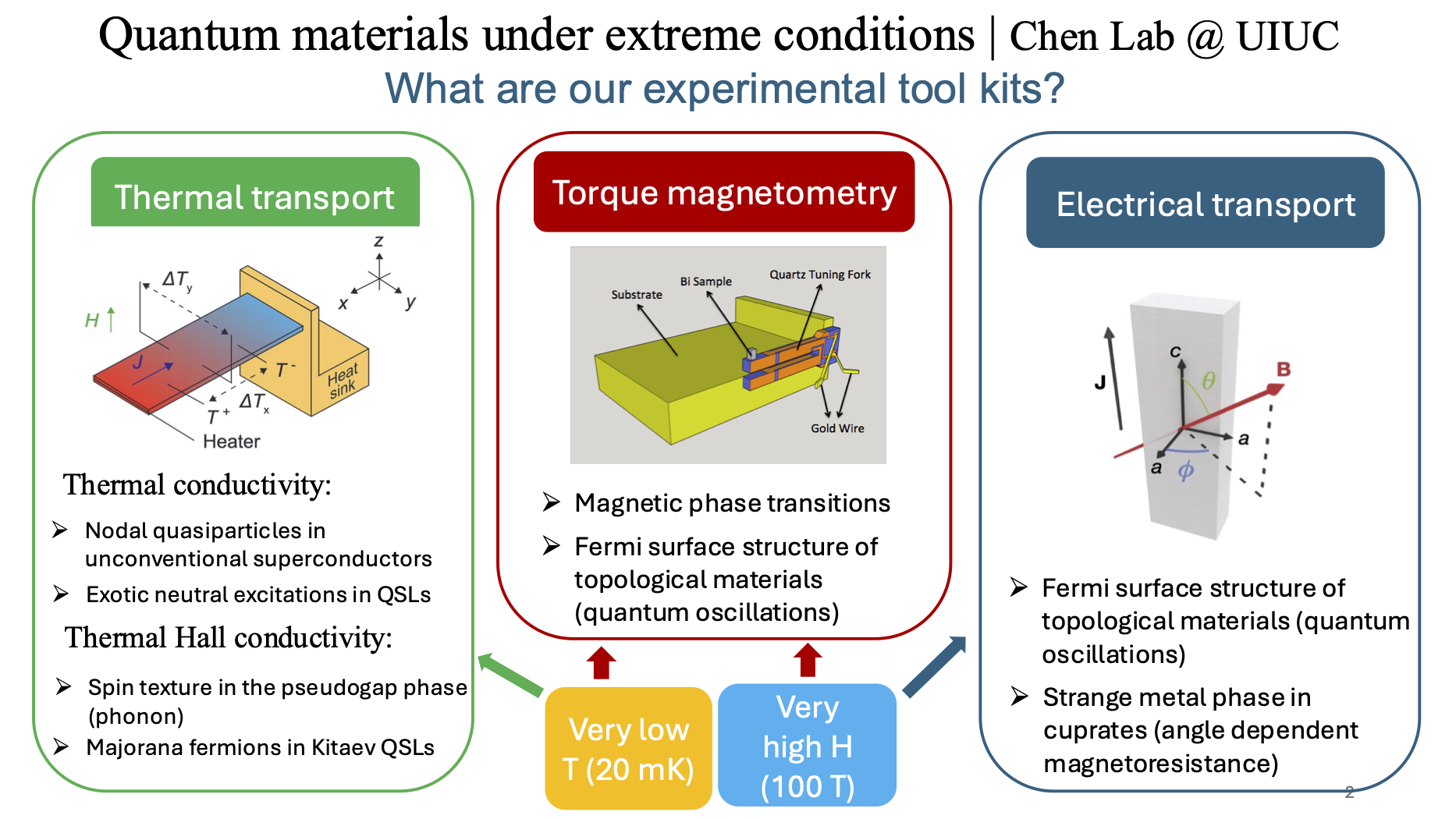 My research interests lie in the field of experimental condensed matter physics, more specifically, quantum materials. The development of modern technologies in all fields highly relies on the properties of materials. The vast majority of materials’s properties can not be fully understood with only classical physics or a single atom’s behavior. Instead, it involves the understanding of collective motions of excitations with strong correlations using quantum physics, which redefines these materials as “quantum materialsâ€. I investigate the thermal, electrical, magnetic, and thermoelectric properties of various novel quantum materials, such as unconventional superconductors, quantum spin liquids, and topological materials at extremely low temperatures down to millikelvin and strong magnetic fields up to 100 Tesla. The experimental approaches that I employ are electrical transport, thermal transport, thermoelectric, and torque magnetometry measurements. Beyond understanding fundamental physics in quantum materials, I am also interested in developing new experimental techniques to advance measurement capabilities. In parallel, single-crystal growth using multiple synthesis techniques is another major focus of my group, which enables systematic control of material quality and access to new quantum states of matter.