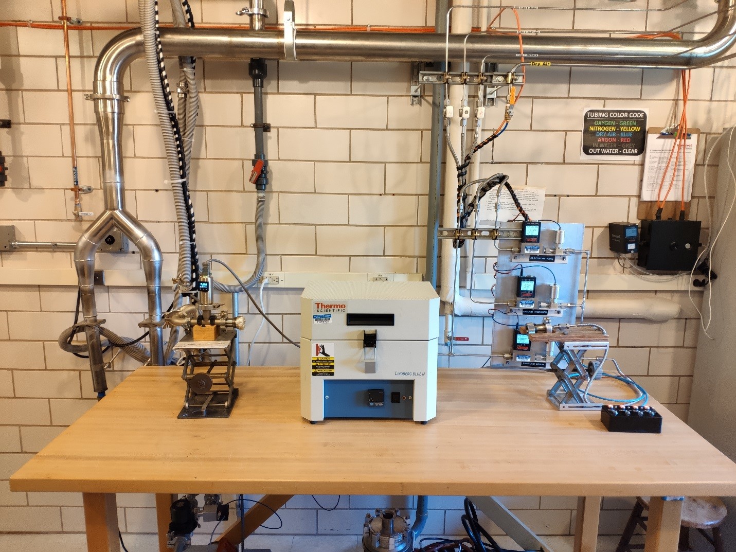 Ultra-high purity methane (CH4), hydrogen (H2) and Argon (Ar) are available for the growth of the above mentioned nanomaterials at temperatures up to 1000 Celsius. CH4 and H2 flows can be controlled in the range of 0-50 sccm. The Ar flow can be controlled in a range of 0-1500 sccm. It is equipped with an oil-free pump to provide an oil-free environment for growth of high-quality graphenes and carbon nanomaterials.