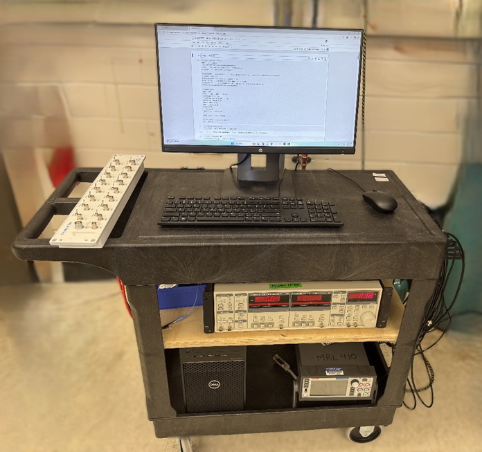 The QD PPMS Instrument Cart connects to the 14-pin LEMO connector on the exterior of the Quantum Design PPMS instruments and diverts the signal to a custom breakout box that allows users to read or source each pin separately. Also included on the cart are a Keithley Model 2450 SourceMeter, a Stanford Research Systems Model SR830 Lock-in amplifier, and a control computer with network access to these instruments and the sample chamber of the PPMS.