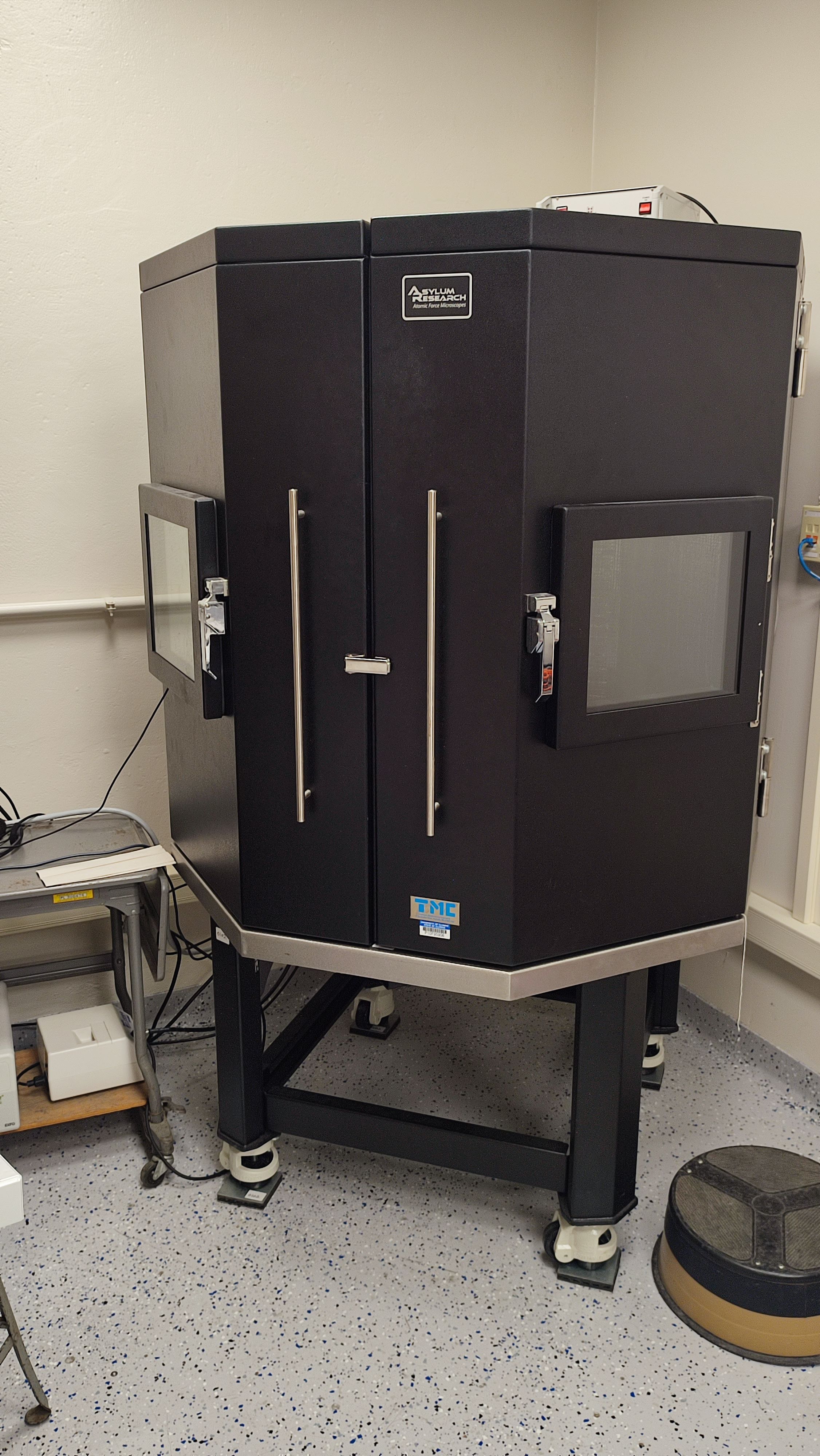 - MFP-3D-Bio Atomic Force Microscope (AFM) from Oxford Instruments for topography and imaging of larger structures (critical for cell work) with the option of samples being kept hydrated and in controlled-temperature environment (live cell imaging capabilities). The system includes the Olympus IX71 inverted optical fluorescence microscope for direct imaging of sample areas of interest. The microscope is located in the MRL 0026 lab.